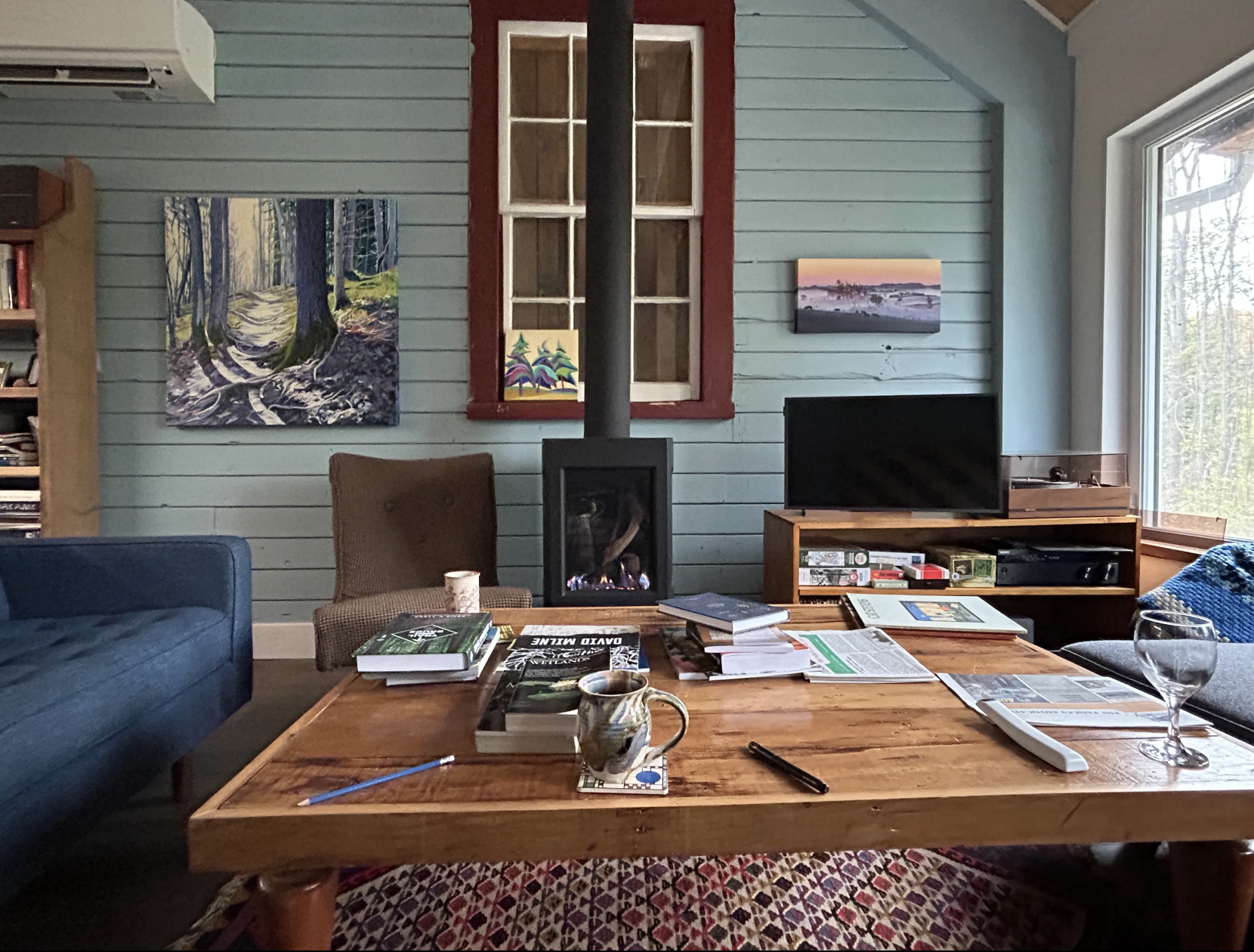 The mill’s studio space is both grounding and inviting, creating a setting that feels lived-in, warm, and quietly beautiful. Outdoors, the property offers space to gather around a fireplace, wander nearby trails, or spend time by the river—inviting moments of stillness, reflection, and gentle exploration.