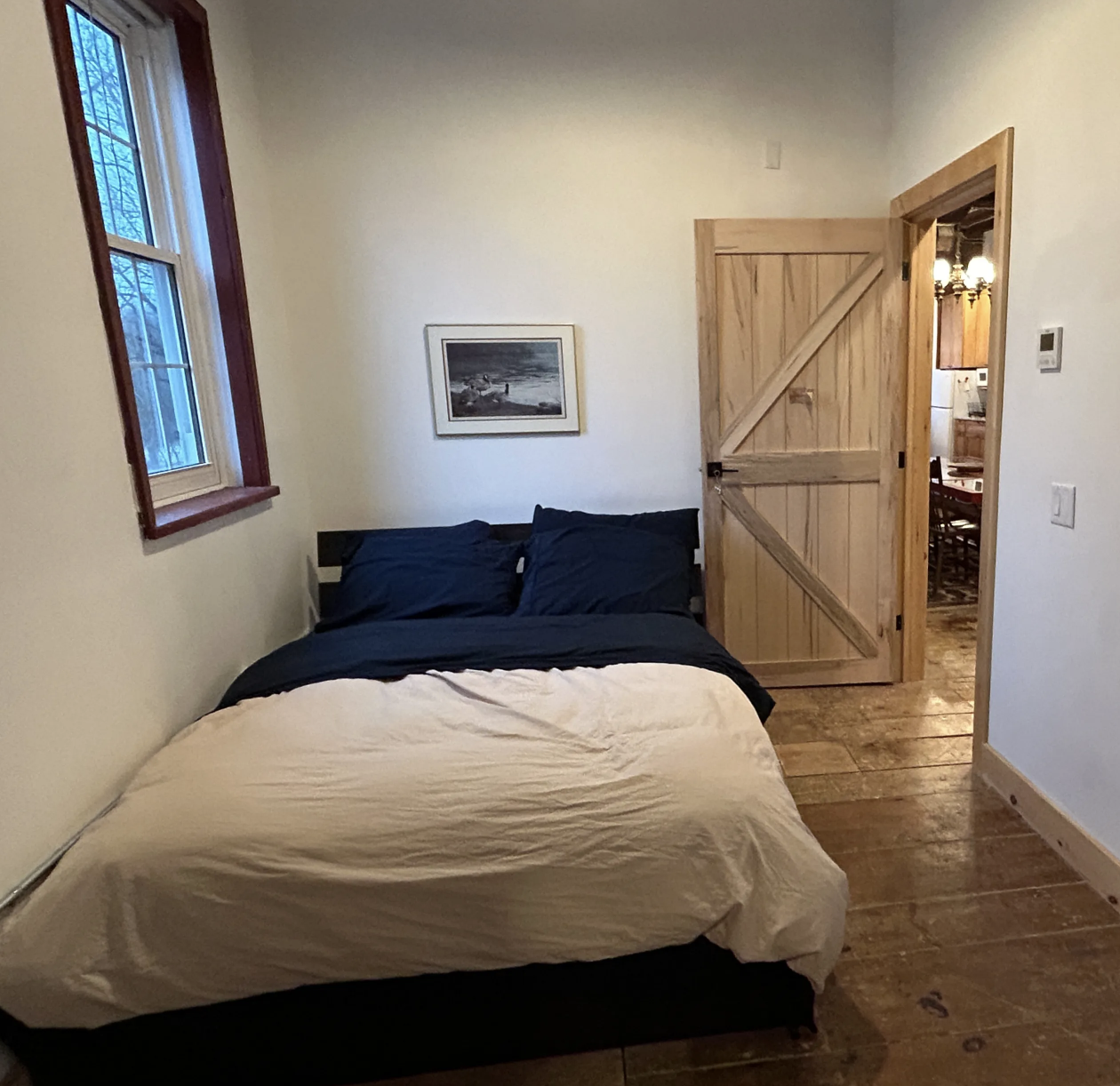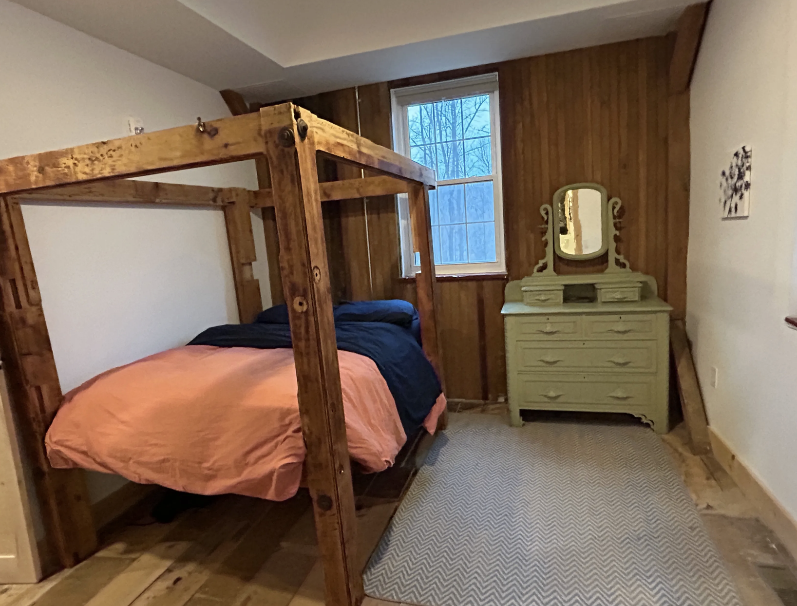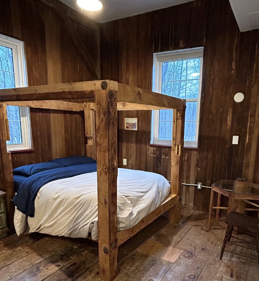 Guest rooms feature double beds with rustic bed frames crafted from historic wood reclaimed from the mill itself. Each room carries a sense of simplicity and care, offering a restful place to land at the end of the day.