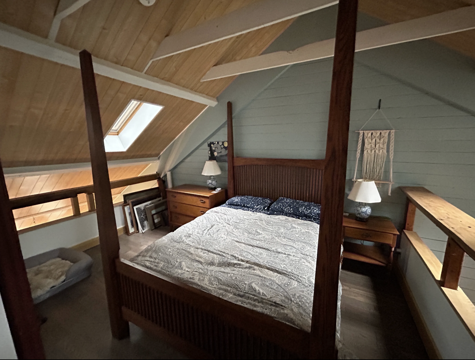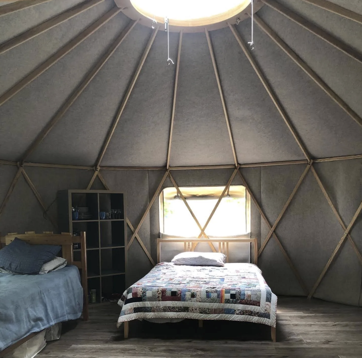 In addition to the bedrooms in the mill, there is also a private yurt available for two guests. The yurt is a spacious 225 square feet, featuring three large windows and a central dome skylight that fills the space with natural light.