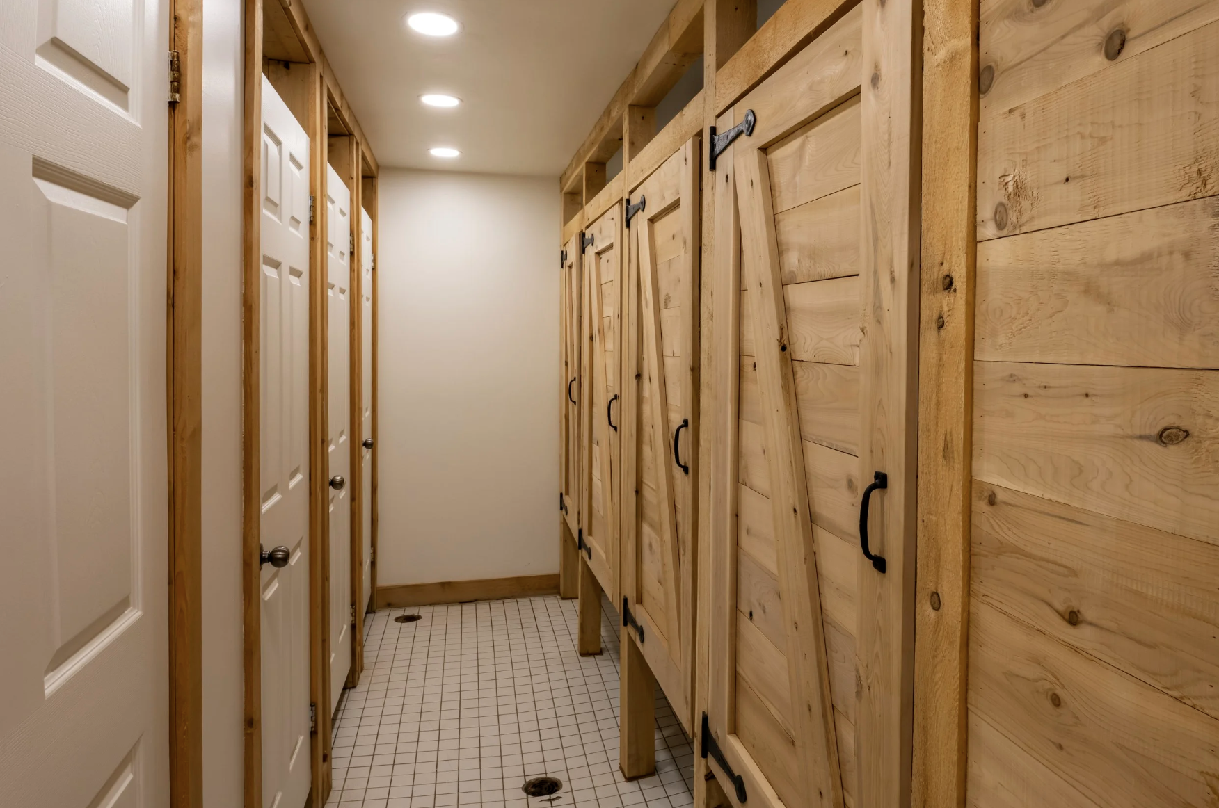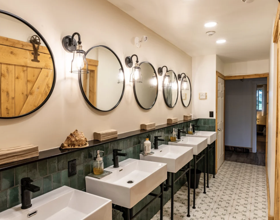 Washrooms are shared and designed for ease and privacy, with five sinks and mirrors, four individual toilets (one wheelchair accessible), and four individual showers (one wheelchair accessible).