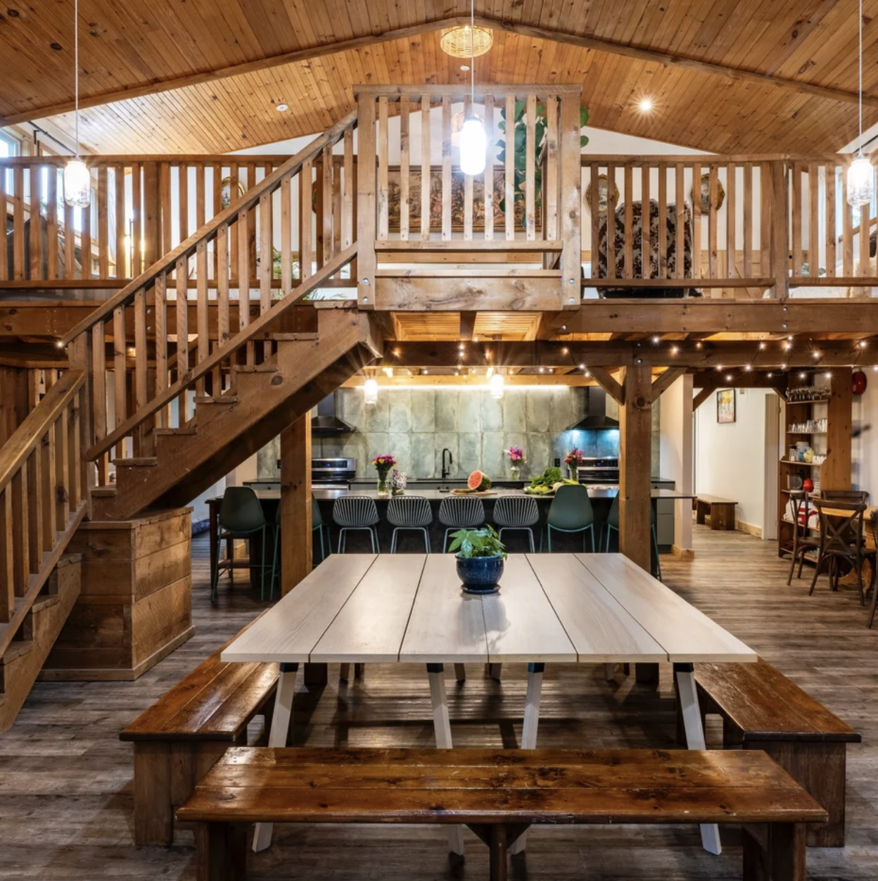 The lodge offers eight bedrooms with twin beds and generous communal spaces designed for gathering and solitude alike. The main room features soaring 30-foot ceilings and a mezzanine loft above—a perfect place for yoga, meditation, or curling up with a favourite book.